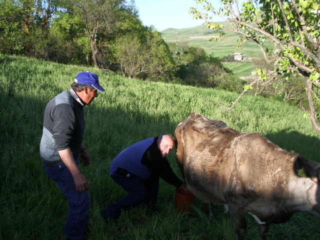 I gave Franca my American coffee canister as a gift and I also brought a bottle of grappa. Pietro and Leonardo invited me to milk a cow and we headed up to the top of the hill and into a pasture where grazed their twelve cows. Soon I was milking my first cow and the taste of warm milk wasn't too bad. It was a fun experience.