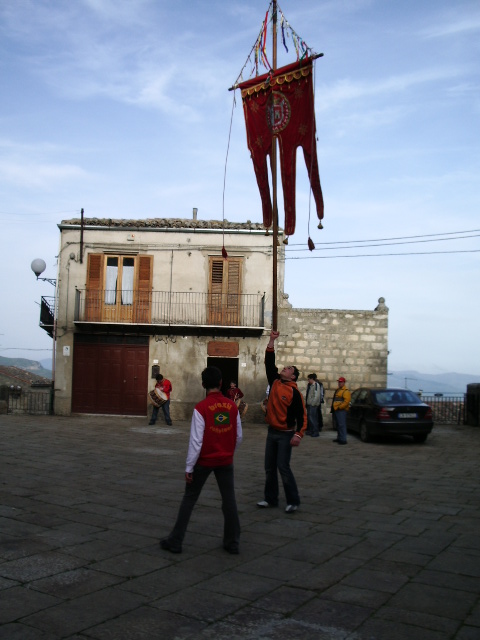 We ran into Gialucca and was invited to witness band practice in the piazza of Peter and Paul. While drummers beat out a steady rhythm a large pole with a banner emblazoned with the town seal was brought out and Gianluca balanced it on his arm, then shoulder, and chin. Each member took turns practicing and a smaller version was used by the younger boys. The pole weighed 50 kg. The piazza filled with people (about 20) to watch. From this vantage point we could see the town of Gangi sitting on a distant hill and Mount Etna capped in snow.