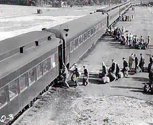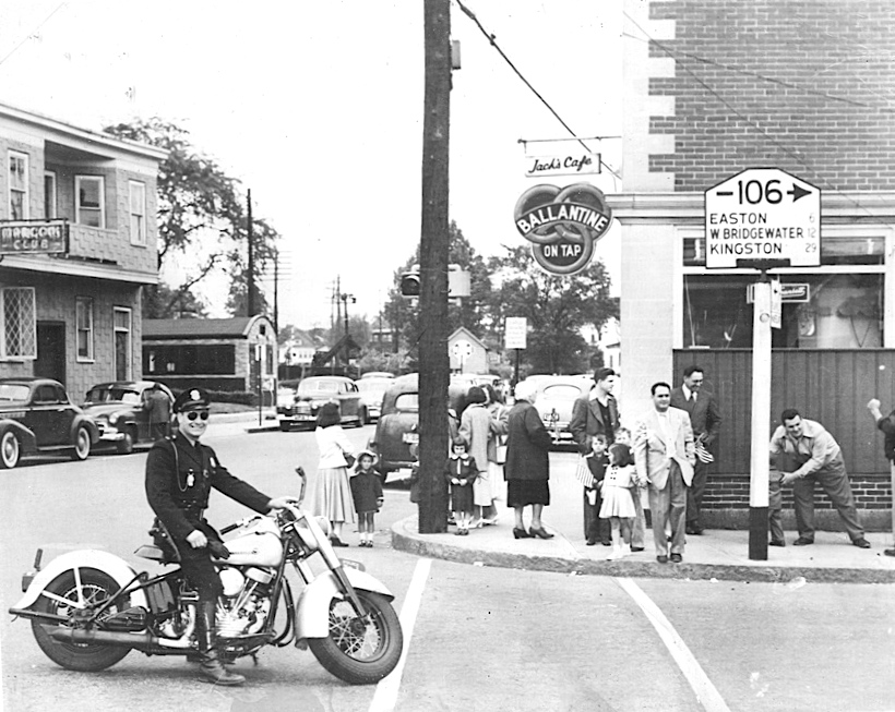 The Army created an embarking spot and Camp Myles Standish in Taunton, Mass., came into being. They had a quartermaster set-up so that they could outfit an entire Division in 24 hours to go to Africa or Iceland. Train traffic every night was a frantic mix of chaos and order. Troop trains came through Mansfield from Springfield, Providence and Boston, heading for Myles Standish and Camp Edwards. Commuter trains and truck convoys carrying workers and supplies intersected at Depot Square in Mansfield. Roger Thayer, still on the police force in Mansfield, was working the 4 AM to Noon shift and drew traffic duty at Depot Square every night. He stood on the corner of Cuneo's and Flammia's Shoe Repair and directed traffic.