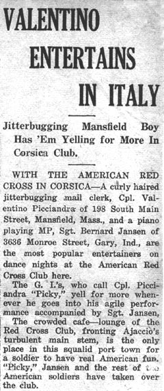 Young Valentino "Picky" Piccandra was in Europe and saw action in the Italian campaign, a common occurrence for Italian Americans to serve in the Army divisions that invaded Sicily and Italy.