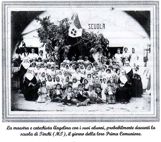 Young Angelina was very religious. Her uncle the priest molded and encouraged Angelina, and she was completely dedicated to God and belonged to numerous religious groups. When she was 21, she was sent to Tinchi, near Pisticci, in the province of Matera to teach school. Living in a little room attached to a school that used to be a barn, she prayed all night, and during the day, she taught her students and led them in prayer. On Sundays she walked all the way to Pisticci (11 kms) because there was no Mass in Tinchi.