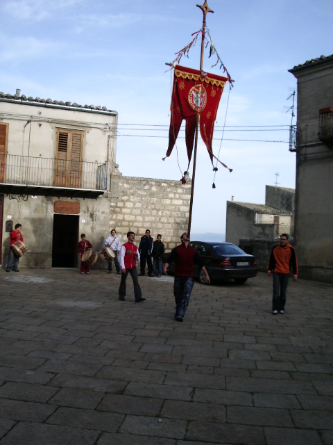 We ran into Gialucca and was invited to witness band practice in the piazza of Peter and Paul. While drummers beat out a steady rhythm a large pole with a banner emblazoned with the town seal was brought out and Gianluca balanced it on his arm, then shoulder, and chin. Each member took turns practicing and a smaller version was used by the younger boys. The pole weighed 50 kg. The piazza filled with people (about 20) to watch. From this vantage point we could see the town of Gangi sitting on a distant hill and Mount Etna capped in snow.
