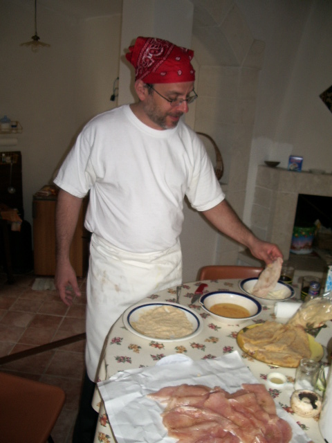 Dinner was served at 9:00pm. Roast pork, artichoke fritters, potatoes, salad, cheese, Leonardo's white wine, and homemade bread. It was wonderful. One cheese was a local ricotta known throughout Sicily. Unlike the American version this ricotta is white and solid, made that way by the use of salt (another local industry is the extensive salt mines in Petralia). The ricotta was mixed with red peppers to give it a wonderful flavor and texture. Local tangerines and blood oranges and a hot espresso coffee topped off the meal.