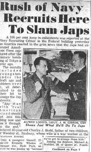 My father, Alfred G. LoDico, age 28, was one of those who enlisted when the age restrictions were dropped. He grabbed a large monkey wrench and posed for the newspaper saying, "Now let's really knock the hell out of them, and don't think we won't and can't do it".